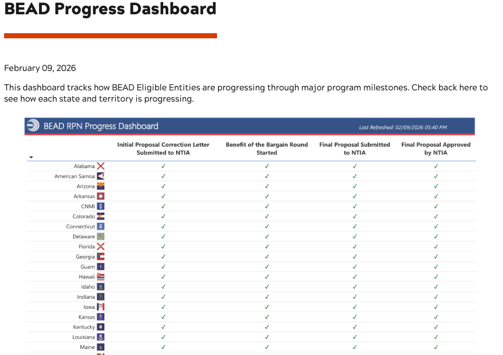 The Broadband Equity, Access, and Deployment (BEAD) Program Progress Dashboard is an official tool from the National Telecommunications and Information Administration (NTIA) that tracks how states and territories (“BEAD Eligible Entities”) are advancing through key milestones… Read More