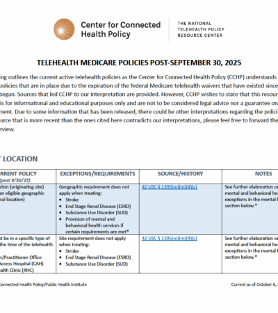 CCHP has created a detailed chart outlining current Medicare telehealth policy, exceptions that exist in permanent law, source documentation, and additional notes. This matrix is designed to give providers a quick reference point when interpreting evolving policy.