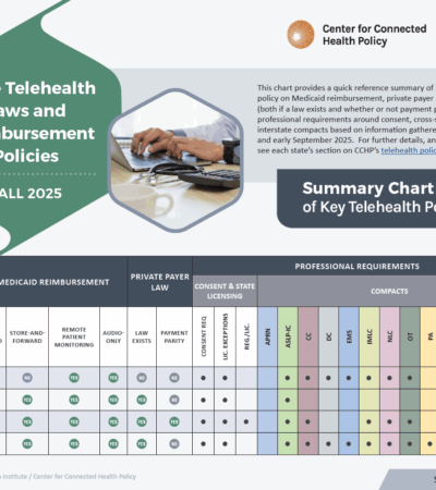 This chart provides a quick reference summary of each state’s telehealth policy on Medicaid reimbursement, private payer reimbursement laws (both if a law exists and whether or not payment parity is required), and professional requirements around interstate compacts and consent based on information gathered between late May and early September 2025.